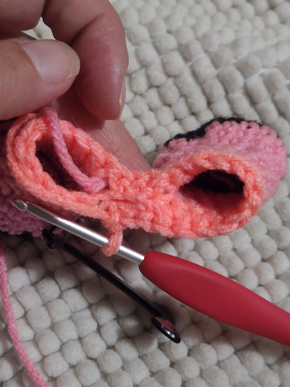 Round 5: hold the two pieces together, and sc x24 around both pieces to attach, fold so the two edges are touching, sc through both st to join x3, 1 sl (3)